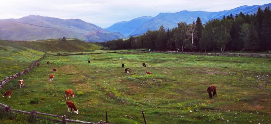 我开门一看,天空已泛起晨曦的光影,只见三五成群的牛马羊顺着村庄的小道前往草场。白哈巴的牧民们,一早将自家的牛马羊栅栏打开,牛马羊就像游击队一样,三三两两从各家院子走出来,到熟悉的草场去享用它们的丰盈草食。不要小看这些牛马羊,它们走多远都知道回家的路,每到傍晚就会各回各家各找各妈,既不会丢失也不会离家出走。