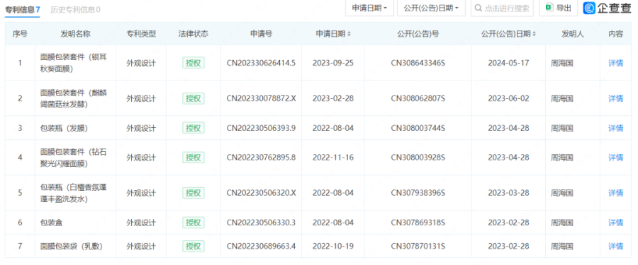 而实际上,FB虽然营销用语看起来高端且富有科技感,可一直也并没有显示出太多的科技证据。拿简单的专利技术一项来说,根据企查查显示,范美丽(海南)化妆品有限公司名下有7项专利信息,无一例外全部是外观设计专利。