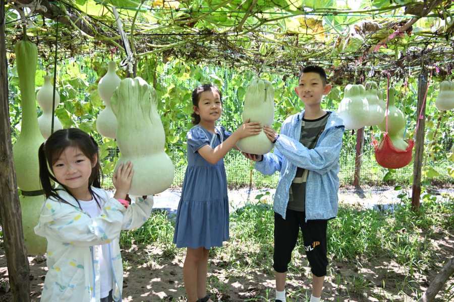 8月1日,夏县禹王镇东浒村郑富中的葫芦园里迎来了一批小游客,小游客观赏着这些特大葫芦不仅啧啧称奇,更令人稀奇的是有七个品相酷似白菜的天然葫芦,大的净高四十厘米以上,根部直径超过二十厘米。培育葫芦30多年的郑富中说该葫芦国内罕见,这种形态奇特的葫芦民间俗称:“百财开花,愿景必达,寓意深长”!。董应赞摄