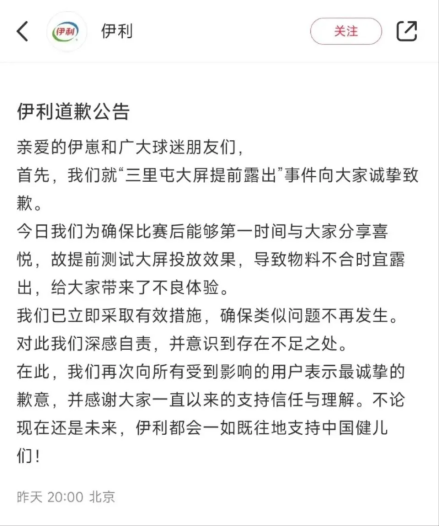而在8月3日晚间,伊利在小红书平台上发布道歉公告称,就“三里屯大屏提前露出”事件向大家诚挚致歉。