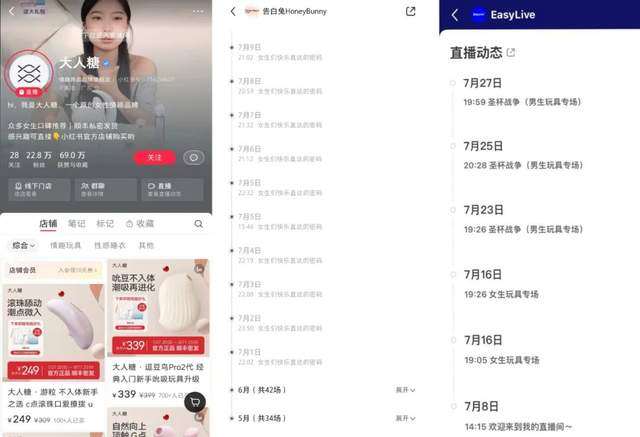 小红书主要是以直播和笔记的方式,为情趣品牌提供流量入口。有品牌方透露,目前只有部分受官方邀请的女用情趣品牌可以在站内直播,国内知名度较高的品牌例如大人糖、告白兔等,都已经在小红书形成了固定的开播节奏。