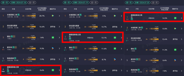 从播放量的维度观察,《唐诡西行》在云合数据正片有效播放市占率排名,一直是“决赛圈”选手表现,上线三天实现播放量Top10进Top3最终登顶的三级跳。彼时暑期档在播头部剧基本上是“大IP+大流量”的爆款配搭,此刻“绝对的质量”压倒流量剧打法,实现了暑期档用口碑硬控观众的局面。