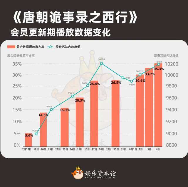 《唐朝诡事录之西行》(下略《唐诡西行》)经历了18天会员更新期终于在昨日收官,除了站内热度峰值高达10205,云合数据播放量市占率更突破35%,吸尽大盘流量。在各出高招的暑期之战里,《唐诡西行》顶住了“剧二代”的压力,也为爱奇艺带来全面霸屏。