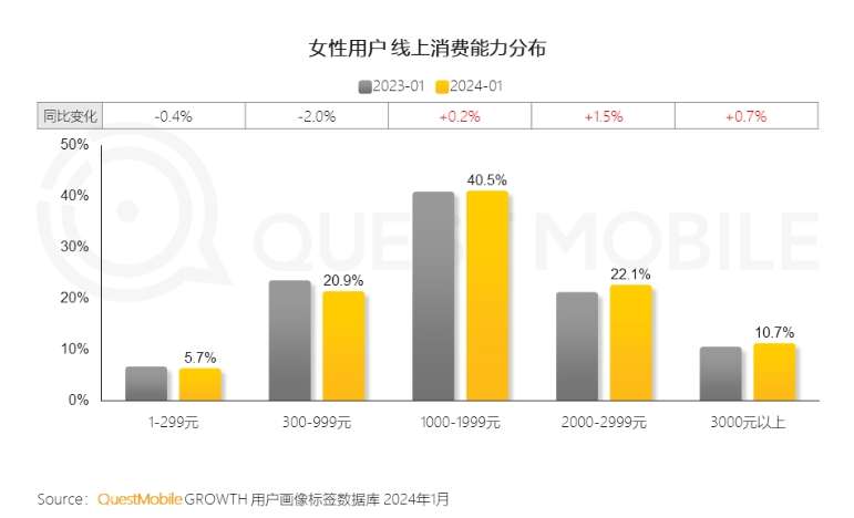 女性用户的钱好赚,是一个公认的事实。根据QuestMobile2024“她经济”洞察报告数据,截止到2024年1月,线上消费能力在2000元以上的女性用户占比达32.8%,同比增长了2.2%,女性群体的消费能力持续提高。