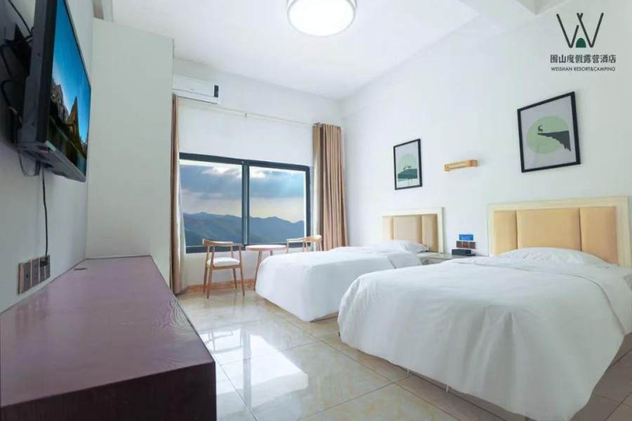 围山度假露营酒店提供了多种住宿选择,满足不同需求的家庭、情侣及朋友群体旅居。在这里,您可以尽情放松身心,享受宁静与舒适。围山度假露营酒店客房部共有42间客房,其中独享静谧的单人间6间、温馨典雅的双人间24间、饱含轻奢与格调的豪华双人间12间。