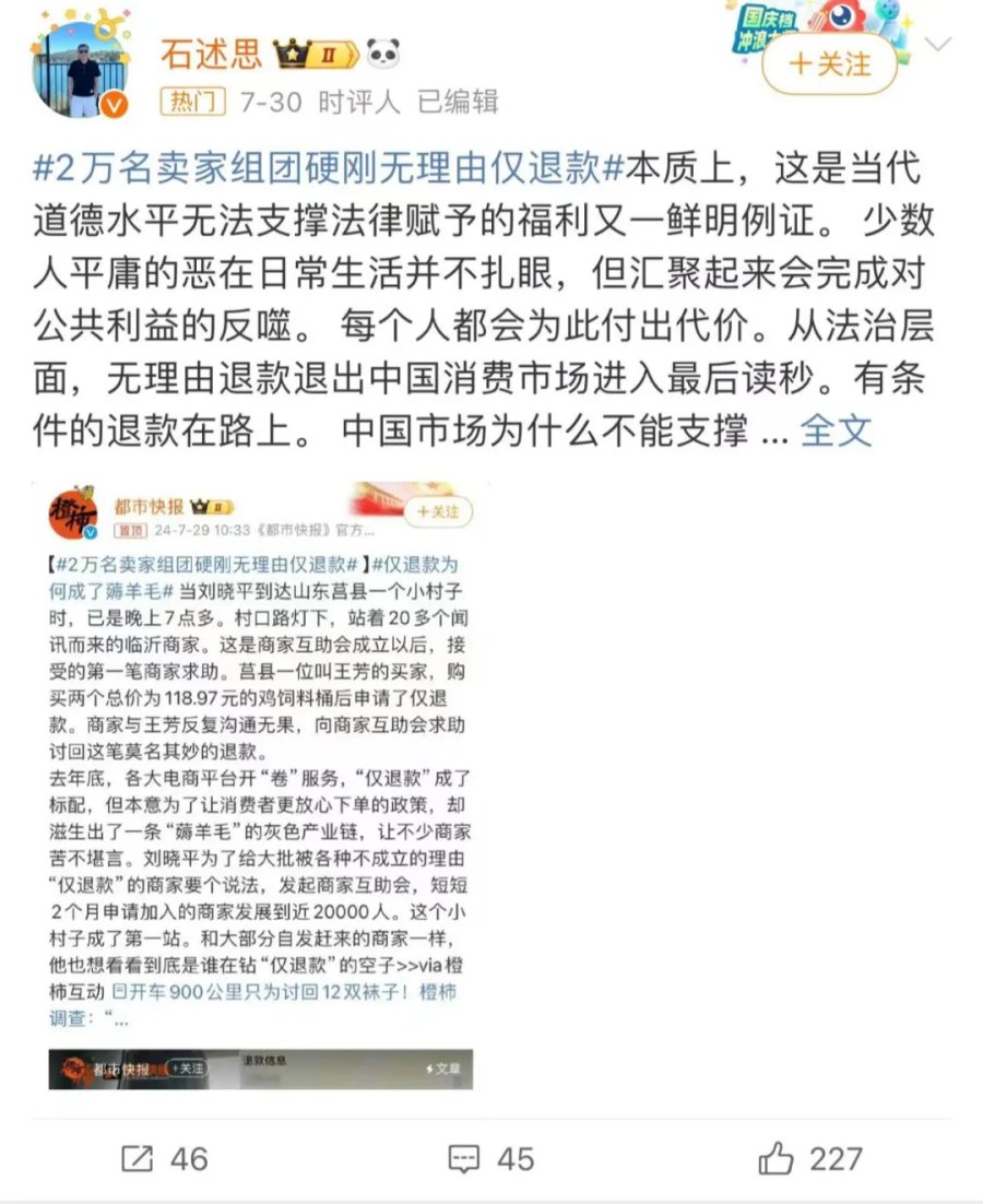 此前仅退款政策太过偏向用户,这一轮则相当于是将天平调平,维护卖家,尤其是中小商家的正当权益。