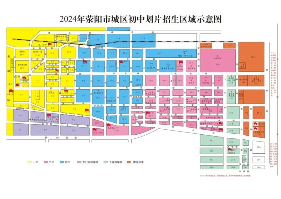 (7)豫龙初中招生范围:除接收城区图上显示片区内的小学六年级应届毕业生入豫龙初中就读,豫龙初中还接收郑上路以南(除飞龙路学校片区)的其它豫龙镇辖区内有住宿需求并愿意到豫龙初中就读的小学六年级应届毕业生。
