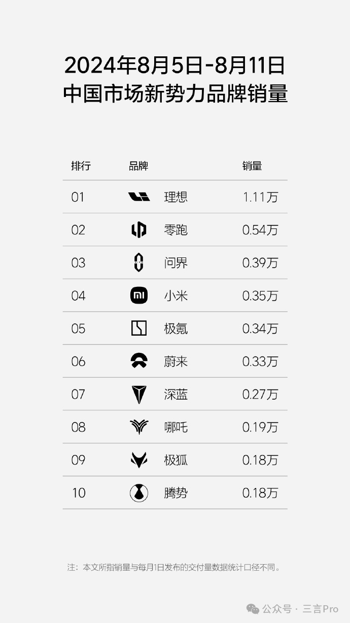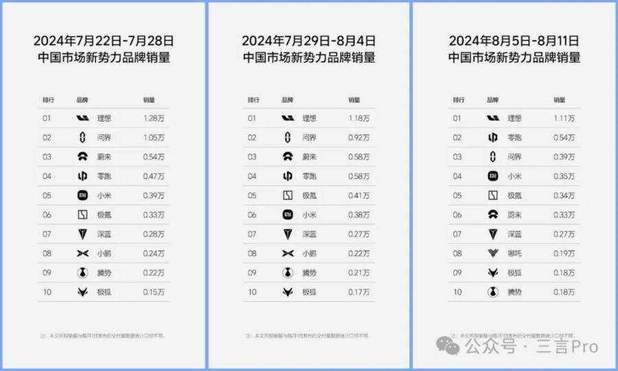 比如,零跑销量就和之前相差不大。小米成为第4,但32周与30、31周相比仅有400到600辆的销量差距。