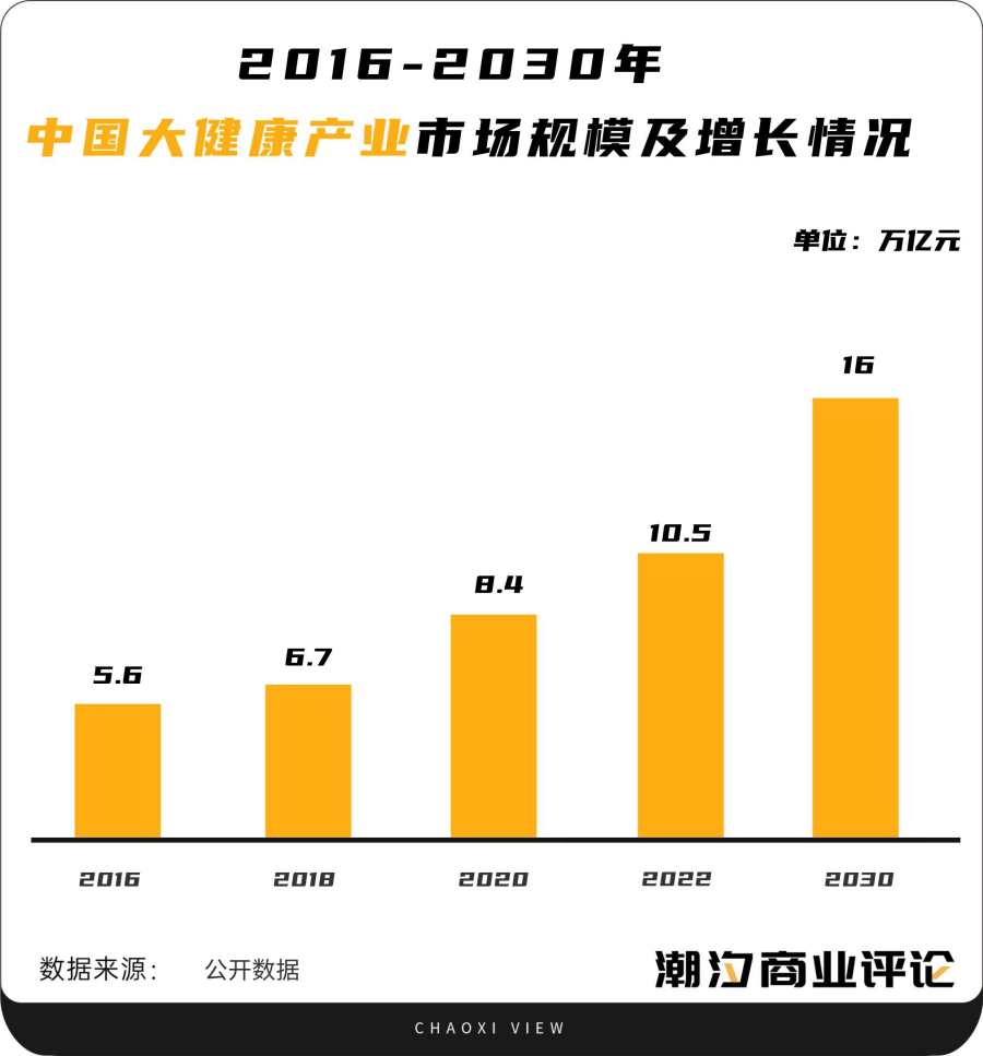 其实不仅仅是年轻群体,全年龄层的中国居民都对“健康”投入更多目光,比如《2023中国健康生活趋势洞察报告》:随着我国消费结构升级,居民健康意识提升,健康产品和技术不断突破创新,健康消费市场的潜力也在加速释放,并预测到2030年,我国健康产业产值预计达到16万亿元。