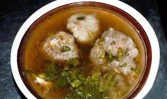 汝南的鸡肉丸子和我们涮火锅的丸子不同,足有鸡蛋大小。丸子最里面包裹着一块儿指甲盖大小的鸡肉,外面是油炸的厚厚的红薯面衣,吃前得先在水里泡,然后再放锅里煮。临了加点葱花香菜,口感非常松软。