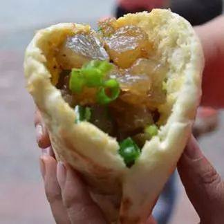 烧饼是发面烧饼,先在鏊子上焙,再放炉子里烤,出来的烧饼白白胖胖,里面呈蜂窝状,用剪刀将烧饼剪开,然后把在平底锅煎好的凉粉夹里面,凉粉里有葱花、孜然、青红椒碎。烧饼被夹得满满当当,得双手才捧得住,饭量不大的人,一个下肚,便饱了。