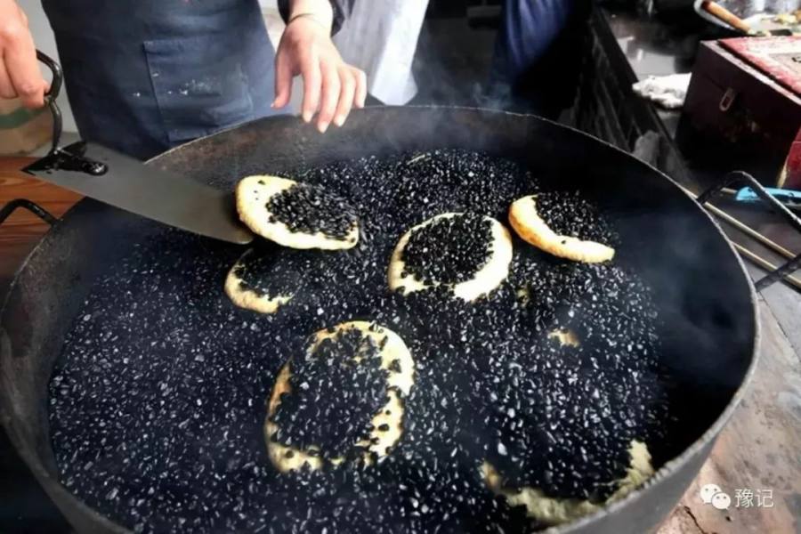 街边一口大铁锅,里面装满了黑色的小石子,烧饼就是被锅里小石子的热度烤熟的。烤好的烧饼表面焦黄,布满了小石子烫出的痕迹。烤好的石子馍从中间切开,麦香扑面而来。