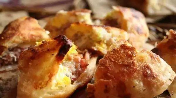 和石子馍豆子般大小的石子不同,制作子馍的石头是鹅卵石。子馍里面馅料丰富,里面有葱花、肉糜,带烧饼在石头上烙制有七层熟时,再往里面加个鸡蛋,吃起来喷香。