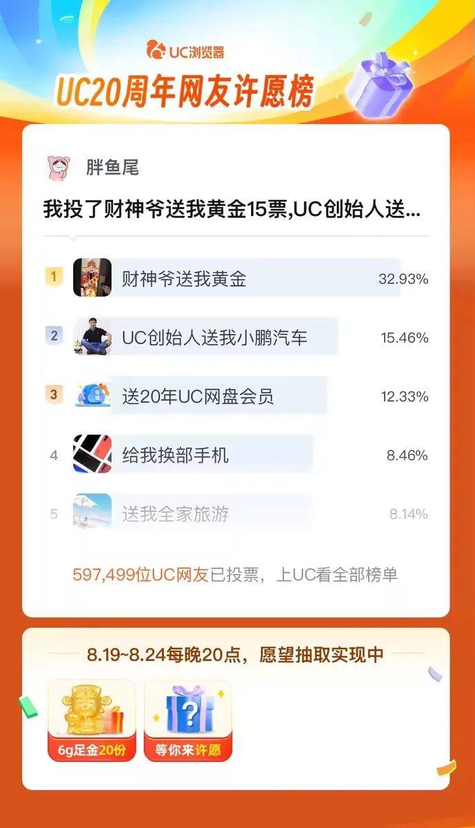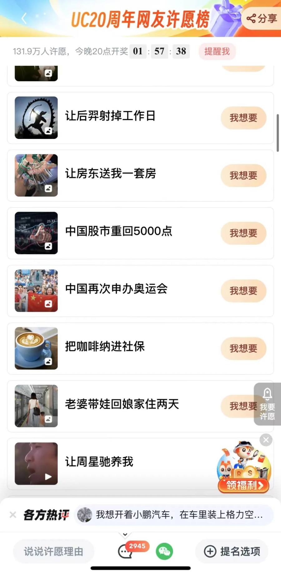 这份许愿榜单,既是场颇有解构意味的集体狂欢,亦勾勒出了UC网友群像。愿望五花八门,但都是UC网友特质的呈现——既有梗又有爱,幽默中透着真诚,戏谑中不失温度。