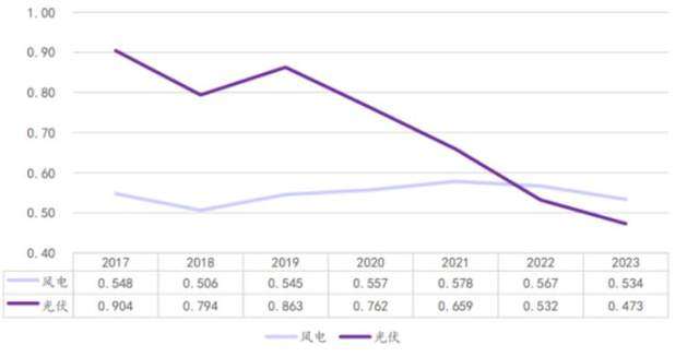(华能国际风电与光伏上网电价走势图,来源:机构)