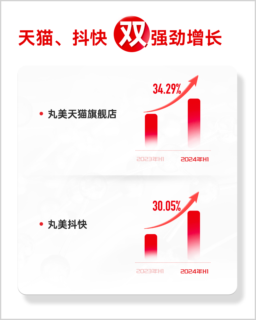 上半年,丸美天猫和抖快也是“双强劲增长”,天猫增长34.29%,抖快增长30.05%,表明经过渠道改革,线上已经进入持续稳定的收获期。
