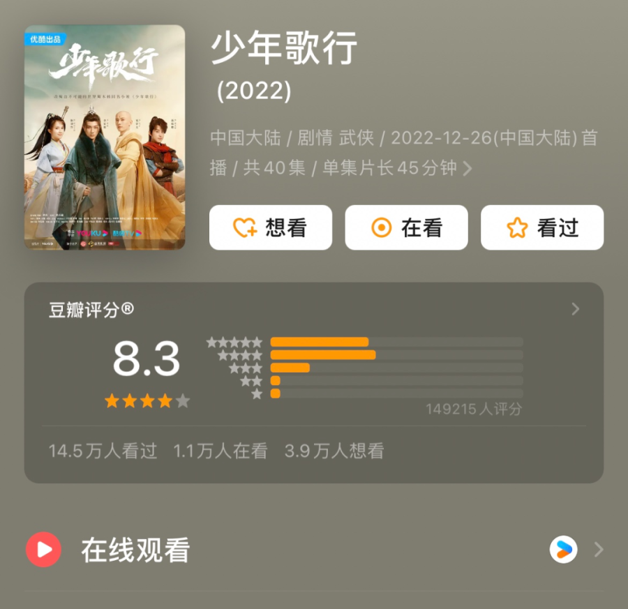 2022年,新武侠剧《少年歌行》登陆优酷,这是一个少年们游历江湖的故事。自此之后,“少年”一词与周木楠紧密相连。这部被不少观众高呼“最适合年轻人的武侠剧”,以豆瓣8.3分的成绩,仍在源源不断吸引年轻人入场。
