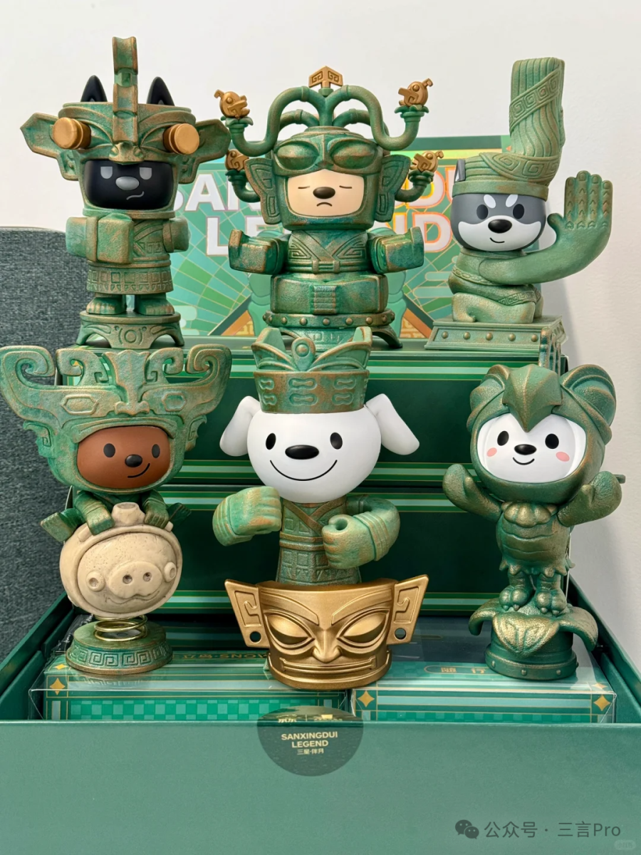 a月饼是三星堆代表图案,DOGA家族公仔形象以三星堆的热点文物为原型,总共有青铜大立人像、一号青铜神树、青铜兽面具&陶猪、青铜扭头跪坐人像、青铜神鸟、青铜戴冠纵目面具6种造型,随机发放。
