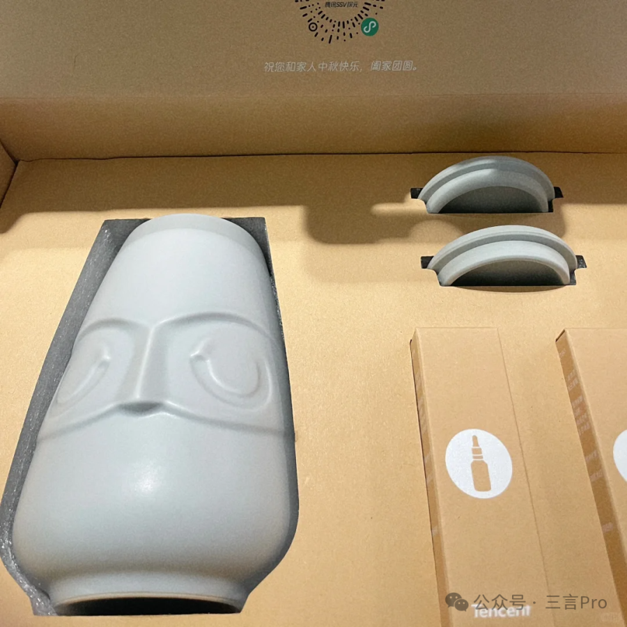 礼盒内部由月饼、公仔、水杯以及茶包组成,到处都是三星堆元素。