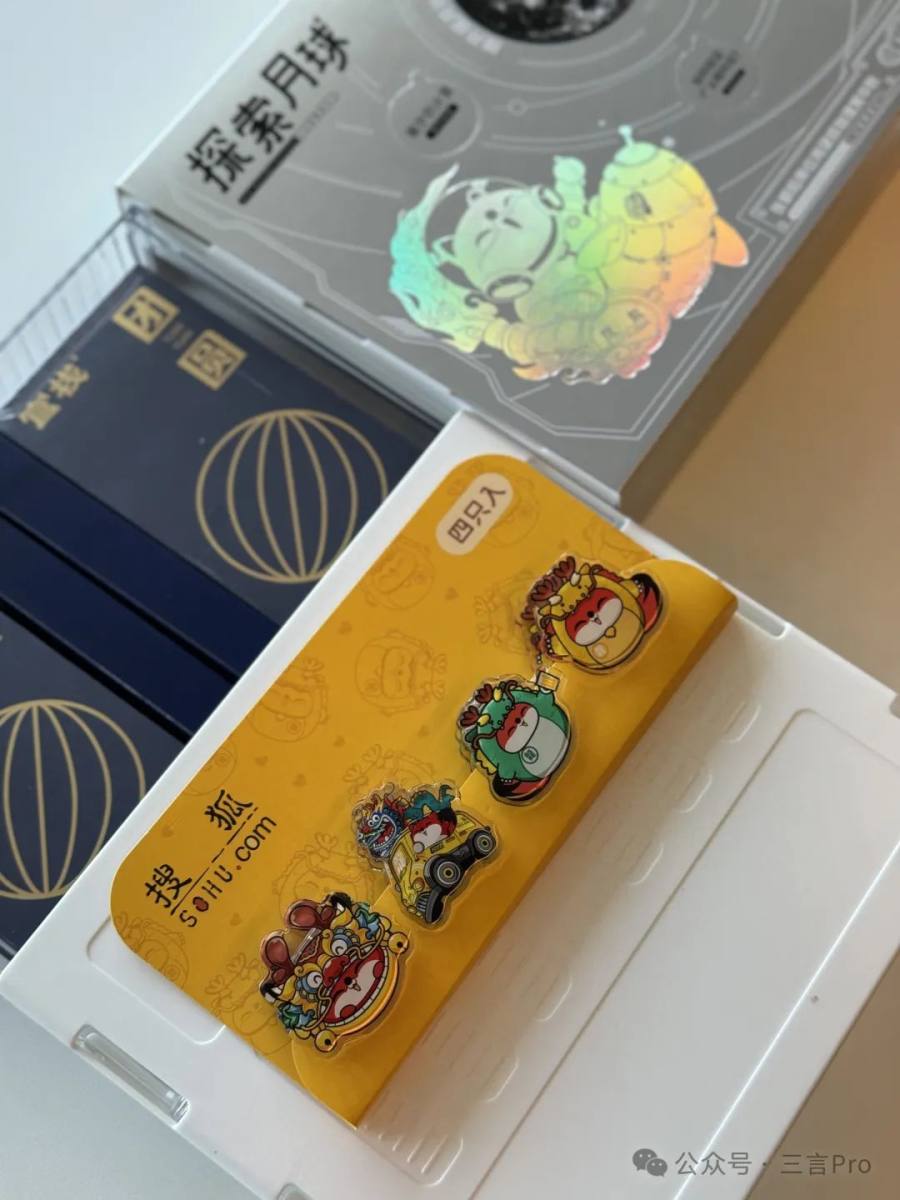 礼盒包含月饼、桌下收纳抽屉盒(月饼包装盒)和搜狐专属小狐狸周边PP夹。