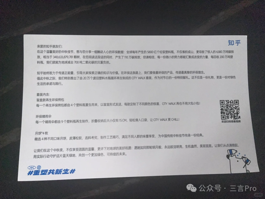 不过,这次知乎的礼盒主打环保理念,包和雨伞都是由塑料再生制作,还是挺有意义的。