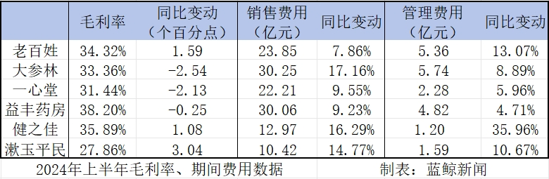 即便如此,连锁药店上市公司仍需要为数量庞大的线下门店支出宣传、管理等费用。2024年上半年,门店数量增长最多的大参林,销售费用同样增长最快。除益丰药房外,其余5家公司的销售费用增速均快于营收增速。