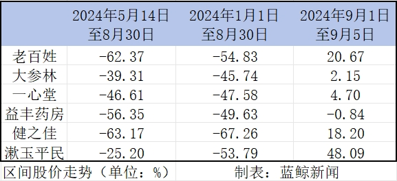 但进入2024年,尤其是5月中旬以来,连锁药店上市公司股价加速下行。同花顺iFind数据显示,2024年初至8月末,老百姓、健之佳、漱玉平民三家上市公司的股价跌幅超过50%,其余三家公司的股价跌幅也在45%以上。