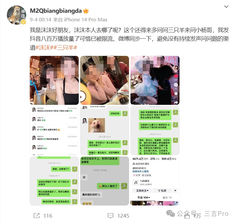 有自称是沫沫好友的网友在微博发文称,“沫沫本人去哪了呢?这个还得来多问问三只羊来问小杨哥,我发抖音八百万播放量了可惜已被限流,微博同步一下,避免没有持续发声问问题的渠道。”
