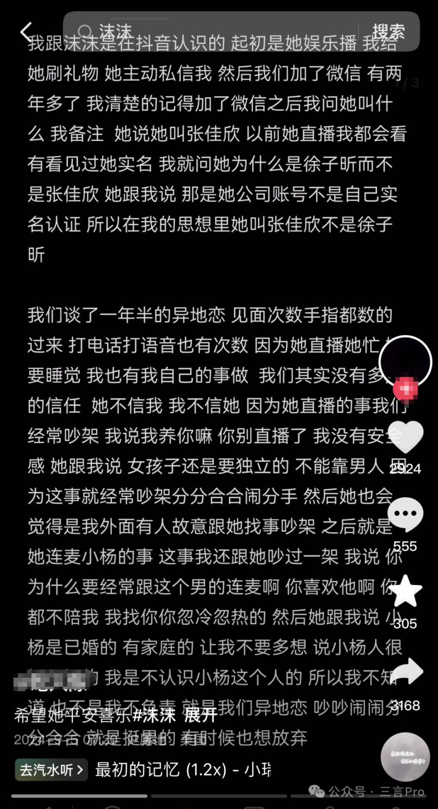 有自称是沫沫前男友的网友发文称,其与沫沫是在抖音认识的,沫沫说自己叫张佳欣。对于沫沫抖音实名认证为“徐子昕”而不是“张佳欣”一事 ,沫沫的解释是公司账号,不是自己实名认证。