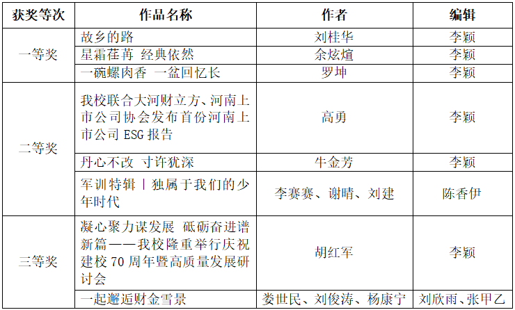此次评选,该校校报共报送8件作品。其中刘桂华的《故乡的路》、余炫煊的《星霜荏苒 经典依然》、罗坤的《一碗螺肉香 一盆回忆长》获一等奖;高勇的《我校联合大河财立方、河南上市公司协会发布首份河南上市公司ESG报告》,牛金芳的《丹心不改 寸许犹深》,李赛赛、谢晴、刘建的《军训特辑|独属于我们的少年时代》获二等奖;胡红军的《凝心聚力谋发展 砥砺奋进谱新篇——我校隆重举行庆祝建校70周年暨高质量发展研讨会》,娄世民、刘俊涛、杨康宁的《一起邂逅财金雪景》获三等奖。