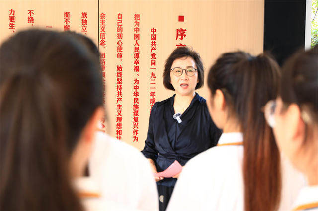 在新建成的思政文化长廊,沈洁霞以现场教学的形式,围绕“重温党的百年奋斗历程,为中国式现代化挺膺担当”主题,为学生讲授“开学第一课”。沈洁霞带领同学们回顾了中国共产党从一大到二十大的光辉历史,她表示,中国共产党自1921年成立以来,始终坚守为中国人民谋幸福,为中华民族谋复兴的初心使命。始终坚持共产主义理想和社会主义信念,团结带领全国各族人民为争取民族独立、人民解放和实现国家富强、人民幸福而不懈奋斗。