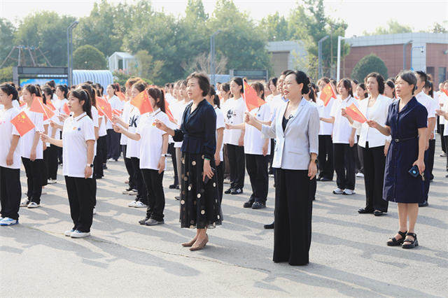 随后,在国旗广场,何新校长以《笃行实干担使命 砥砺奋进谱新篇》为题讲授“开学第一课”,她简要总结了近期学校在全国第七届艺术展演、全省教学能力比赛、思政课比赛等方面取得的成绩,通报了暑假期间事关同学们学习、生活的建设工程情况:校园很快就能实现WIFI全覆盖;学校餐厅已经完成改造升级;思政文化长廊将成为靓丽的名片;宿舍空调正加快安装。各项基础条件正在持续改善。