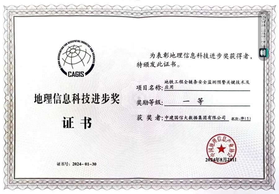 8月28日,2024年度中国地理信息科技进步奖评选结果揭晓,中建国信大数据集团有限公司(以下简称“中建国信”)凭借“地铁工程全链条安全监测预警关键技术及应用”成果在科技创新、实践应用方面的贡献,荣获地理信息科技进步奖一等奖。