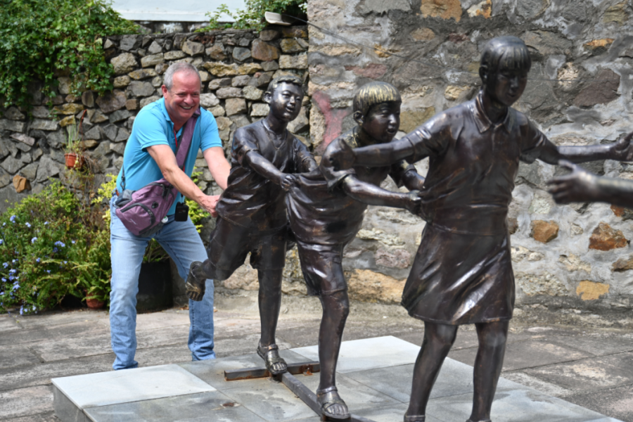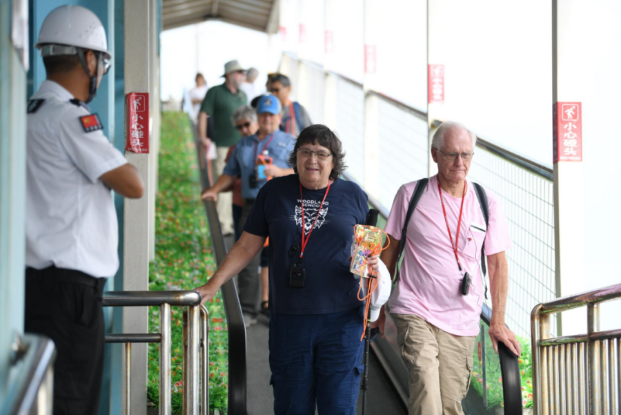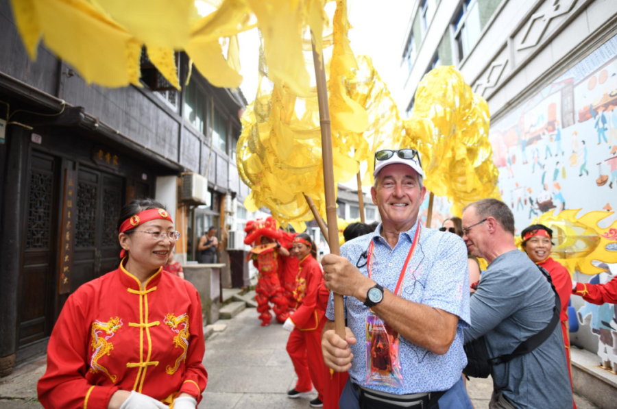 在英语导游的帮助下,不少外籍游客还与当地村民热情互动。来自美国佛罗里达州的游客瓦尔特和村民张贤松一见如故,两人寒暄了一番,告别前,他们还在游客服务中心前合影留念。“舟山是个很美的城市,这里的人热情好客,我很喜欢。”瓦尔特开心地说。