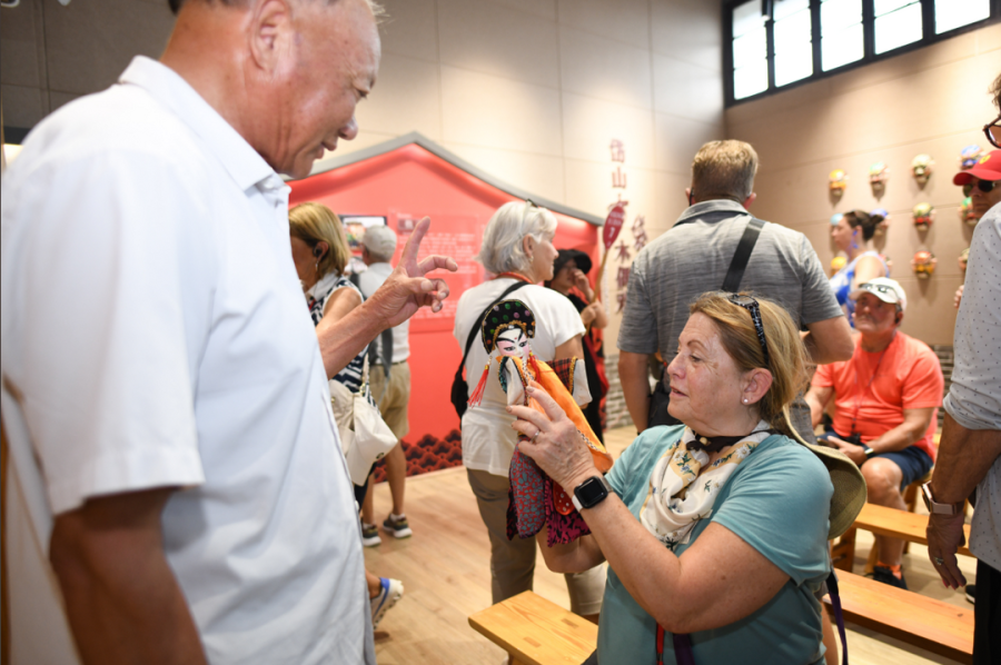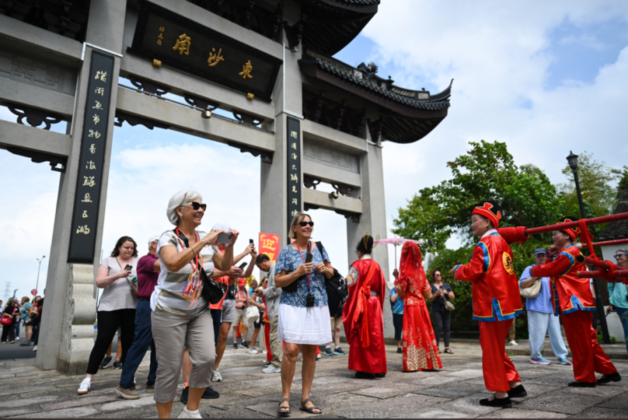 在昨日“招商伊敦”号靠泊舟山期间,650余名欧美游客纷纷走下邮轮,分别搭乘大巴车前往朱家尖、岱山、普陀山等地游玩。在岱山东沙古镇,游客们不仅一路品尝海棠糕、海石花、香干等特色美食,还观看了舟山走书、布袋木偶戏、马灯舞、舟山渔民号子等非遗表演,感受舟山古渔镇的传统文化魅力。在一间古色古香的渔民画馆内,一幅幅神情生动、绚丽缤纷的渔民画,令众多外籍游客发出啧啧赞叹,老渔民画家蔡成世还被游客们团团围住,听他讲述渔民画背后的故事。