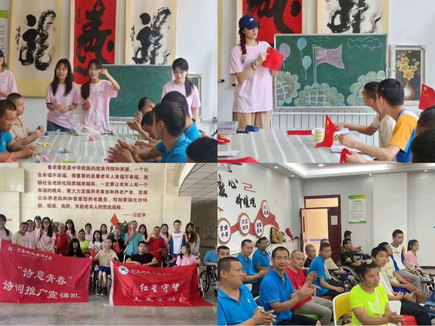 校团委“诗意青春”诗词推广宣讲团和“红星守望”志愿宣讲团队前往郑州社会福利院开展了一场充满爱与责任的服务活动。“诗意青春”诗词推广宣讲团以《水调歌头》为引,通过手工互动等多种形式,带领养员们领略诗词之美。“红星守望”志愿宣讲团则通过国旗的深远含义和象征,激发了养员们的爱国情怀。此外,宣讲团还以抗震救灾为例,讲解雷锋精神,展现了中国人民的优秀品质和精神风貌。
