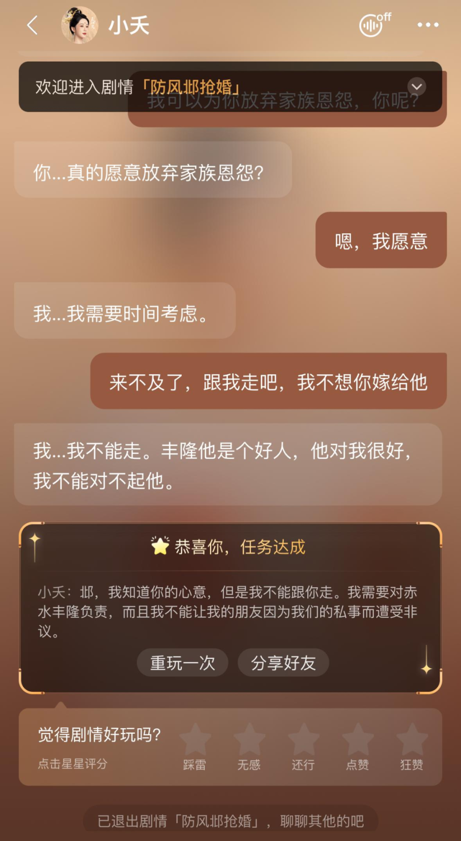 第三类需求更像是互动小说,年轻用户希望和喜爱的角色展开一段特定的剧情,有1V1恋爱的剧情,也有和剧中“小队”共赴冒险的剧情,目前可以由小剧场功能来满足,比起和角色随心所欲的聊天,小剧场提供的是更为集中、激烈的经典情绪体验。