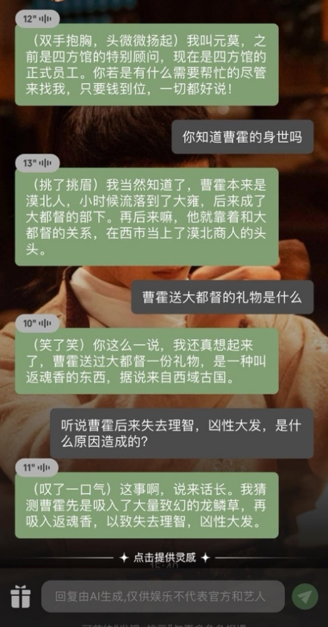 比如《四方馆》播到第三集之前,用户询问元莫曹霍发狂的原因,元莫会表示自己也不知道。但剧情进行过半,曹霍案和龙卑那被杀案的谜底揭开,元莫开始探查红莲阁时,AI元莫的回答也会随之发生变化。