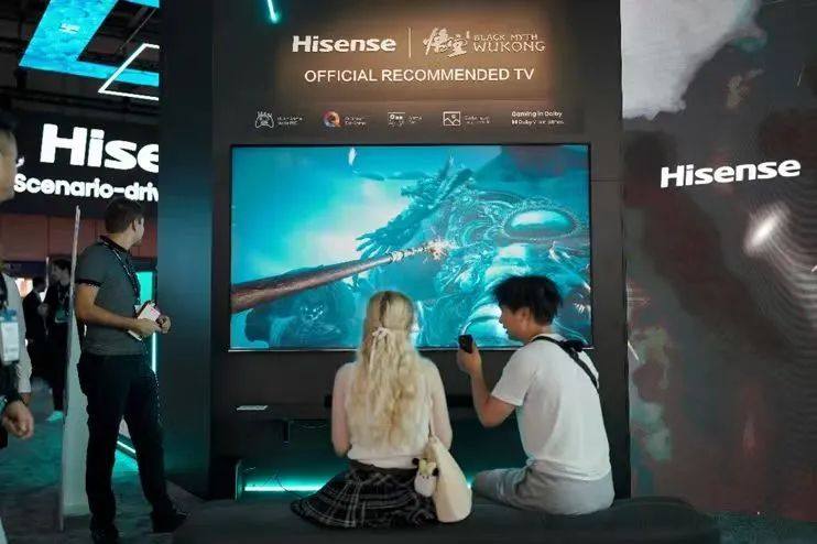 海信抓住了《黑神话·悟空》的热度,推出了一款联名电视,许多海外玩家在现场被游戏“硬控”。该产品中,海信和黑神话美术团队联合定制的专属游戏模式,能通过XDR高动态调优、精准色彩调校和暗部细节增强,还原游戏的各种细节。