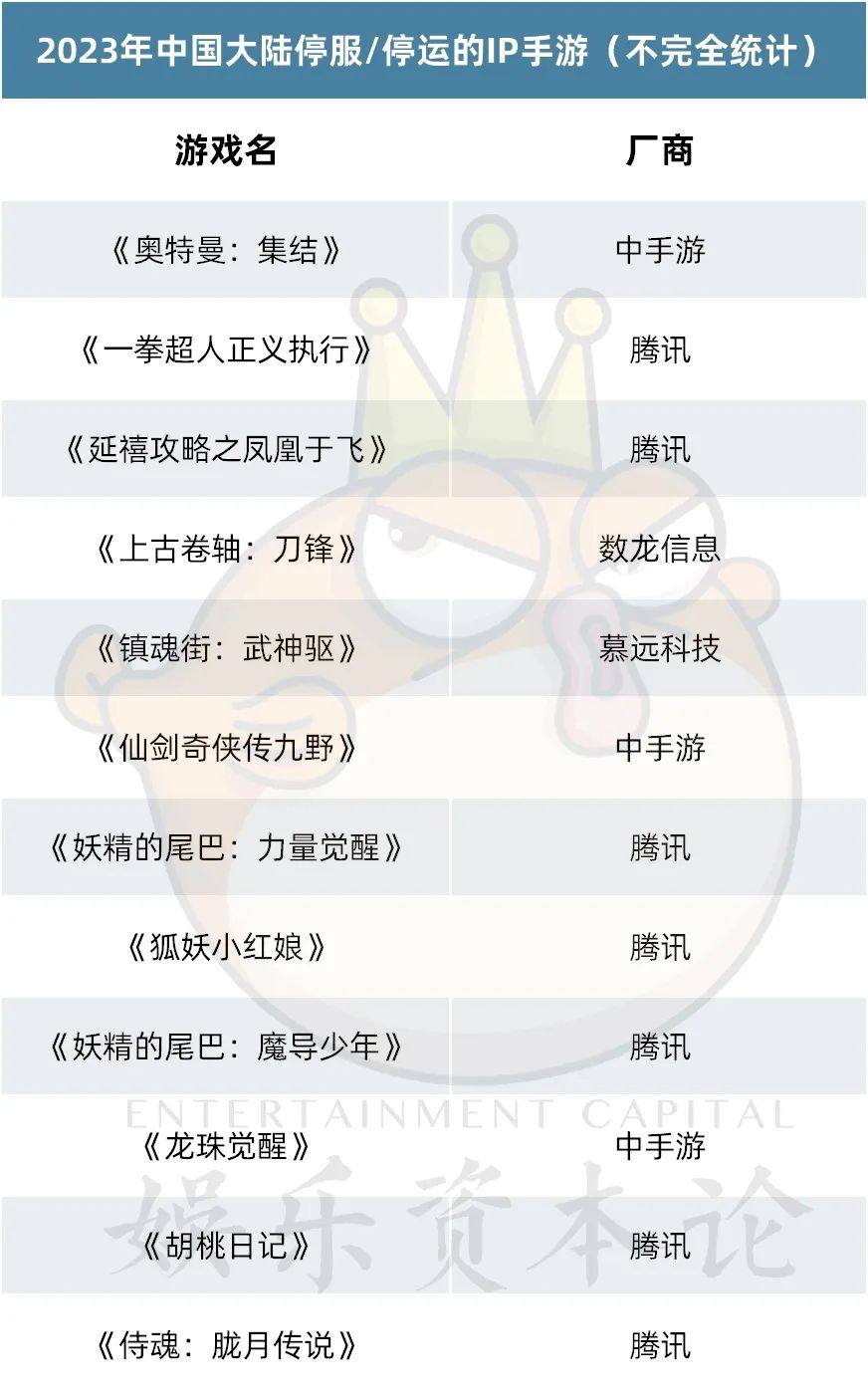 《漫威超级战争》《漫威终极逆转》……包括在2021年关停了国服的《漫威未来之战》在内,都由网易研发或代理。腾讯制作的《秦时明月:世界》《妖精的尾巴:魔导少年》《圣斗士星矢》《一人之下》(注:区别于今年获得版号的《异人之下》手游)等大批IP手游不是已经官宣停运,就是长时间未更新、处于半死不活的状态。