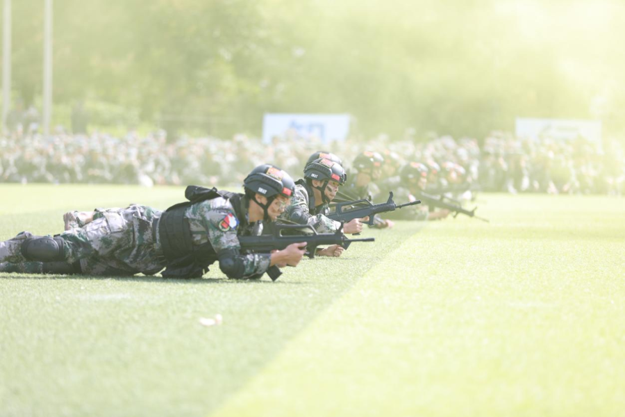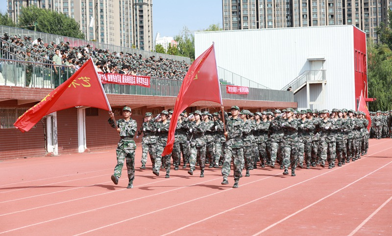 大会在雄壮的国歌声中拉开帷幕。伴随着“标兵就位”“分列式开始”号令的发出,国旗护卫队入场,全体2024级新同学军训汇报表演正式开始,由各学院组成的分列式方阵,整齐划一、口号响亮,迈着整齐的步伐,昂首挺胸正步走过主席台,铿锵有力的步伐、响彻云霄的口号,充分展示了财金学子昂扬向上的精神面貌。随后,擒敌拳方阵、防爆队形方阵、女子匕首操方阵、战术方阵分别进行了汇报表演,一招一式尽显英姿飒爽,为在场师生呈现了一场智慧与勇气、策略与速度的较量,汇报表演精彩纷呈、士气高昂,集中展现了军训成果,赢得了全场师生们的阵阵掌声。