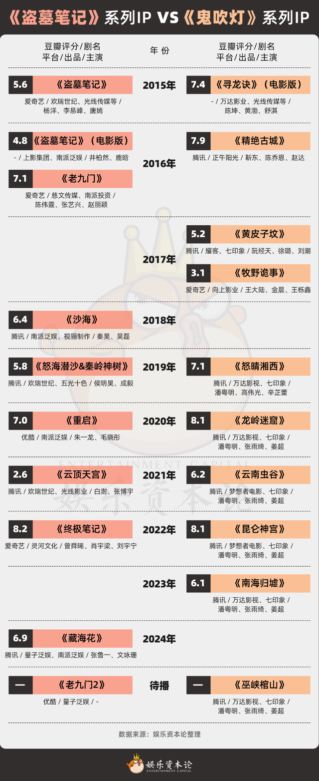 虽然《鬼吹灯》的网剧晚于《盗墓笔记》一年半,在2016年年末才播出,但获得了深思熟虑进行开发考量的时间,也可以说是一种后发制人。