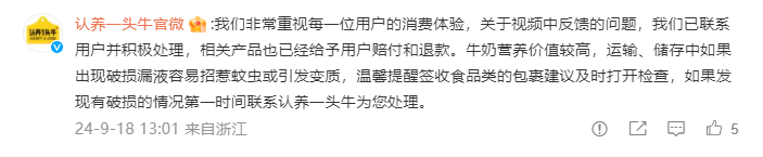 事情引发关注后,认养一头牛官方账号回应了这件事,表示“已经联系用户并积极处理,相关产品也已经给予用户赔付和补偿”。对于为何会出现这种情况,认养一头牛也进行了解释:“牛奶营养价值较高,运输、储存中如果出现破损漏液易招惹蚊虫或引发变质”,建议消费者及时打开检查,若是遇到破损,第一时间联系客服。然而,对于其客服质疑消费者说法的态度,以及“不能相信一面之词”的答复,认养一头牛并没有进行说明。