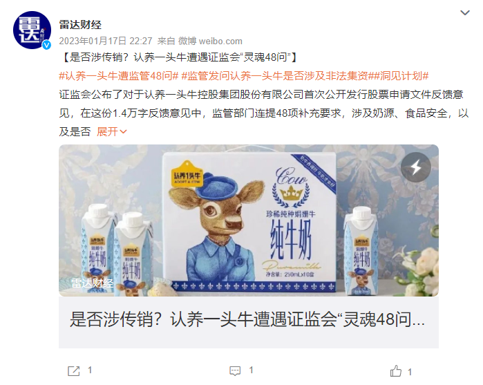 考虑到这些争议,尽管认养一头牛相关负责人表示,撤回IPO是基于公司发展现状、整体发展战略和市场环境综合审慎考虑的结果,但外界认为,由于证监会曾向认养一头牛提出多个问题,包括相关业务的具体情况、是否涉及传销、是否涉及非法集资等,因此认养一头牛撤回IPO与这些争议不无关系。