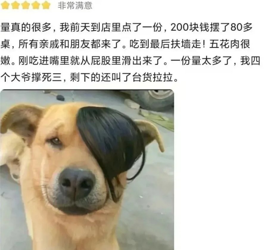 “人间美味,感谢老板不放瘦肉,感谢骑手送凉菜”,五星非常满意,但字里行间全是阴阳怪气。