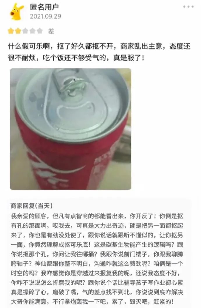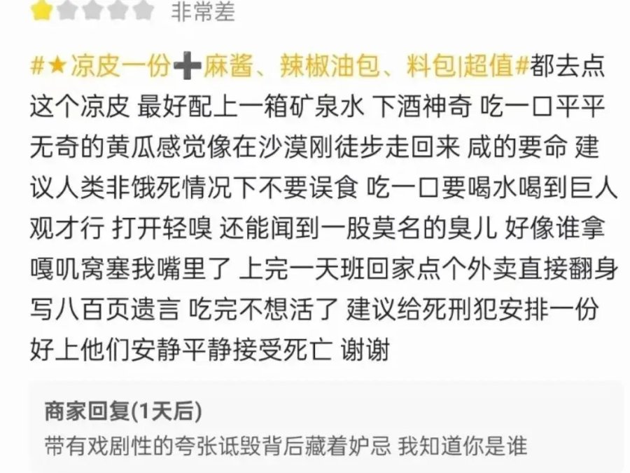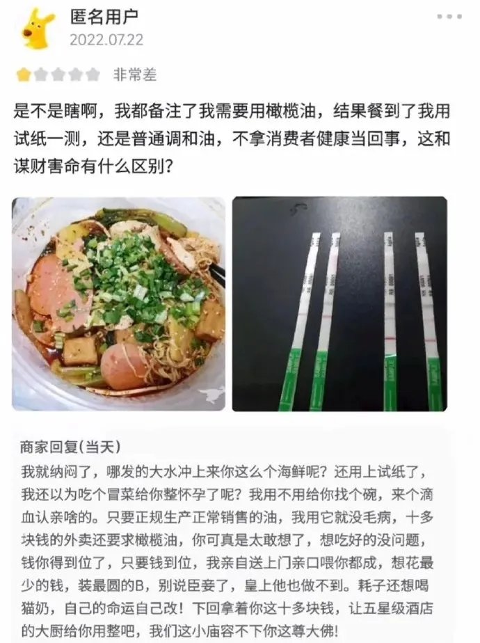 在外卖平台,对餐品的评价本就是非常主观的事,一家店全是好评不一定是真的,但如果差评居多,多少能反映店面存在问题。有的商家心如止水,无论面对多难听的差评,都能够做到眼不见为净。有的商家脾气不好,只要你敢给我差评,我就一定要留言怼回去。