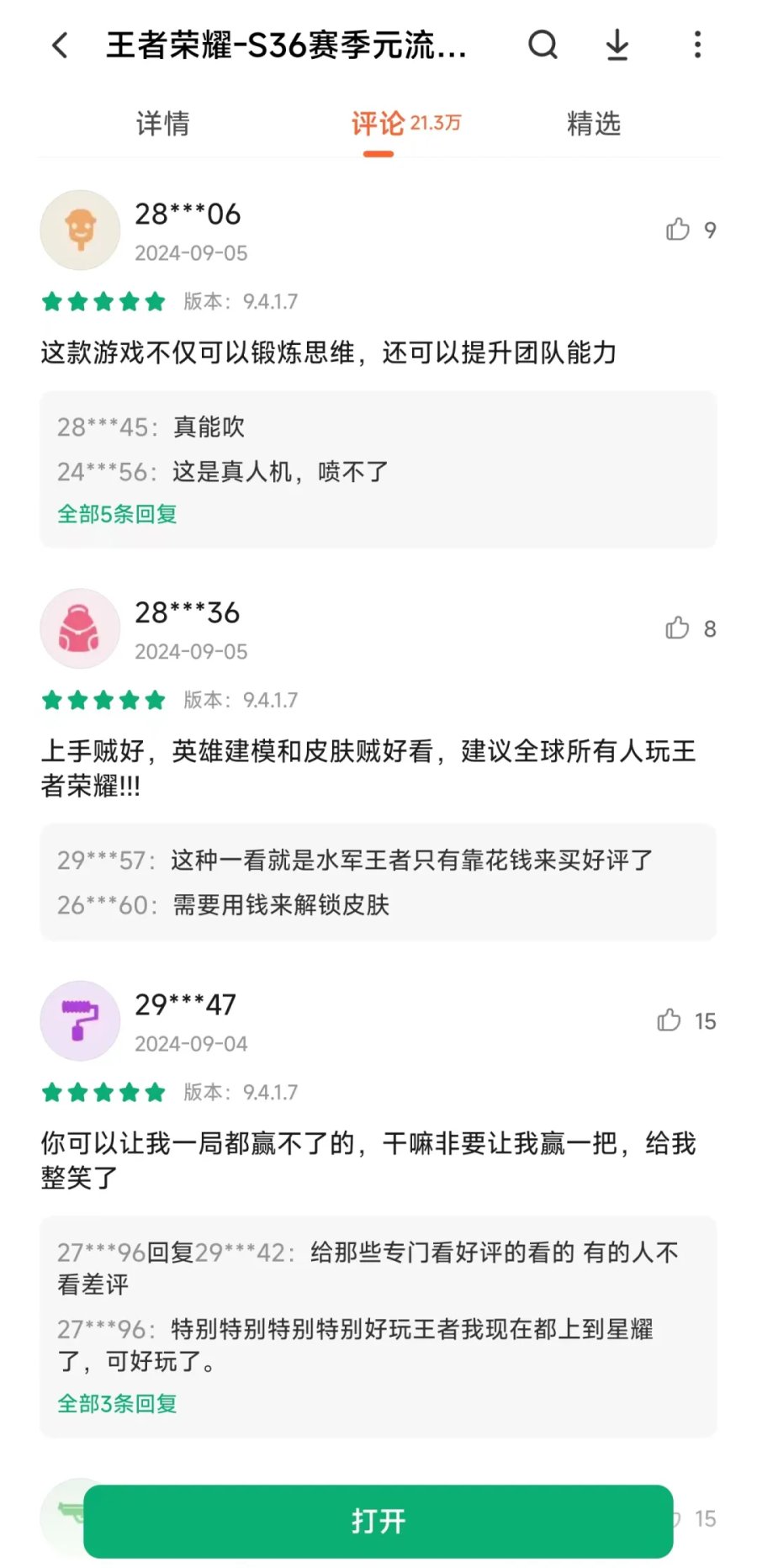 在《王者荣耀》的应用商店好评区,也是差评与机器人齐飞的景象。