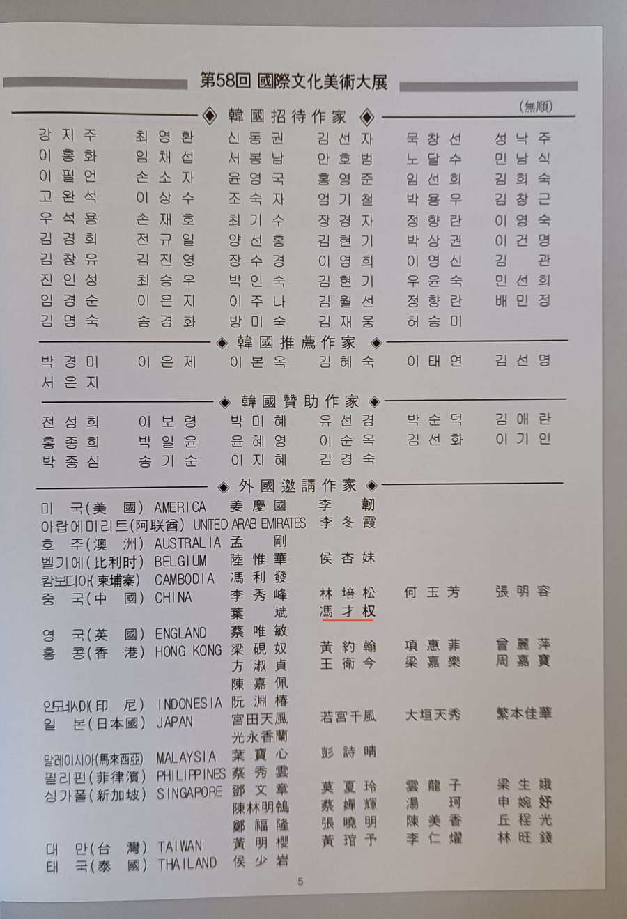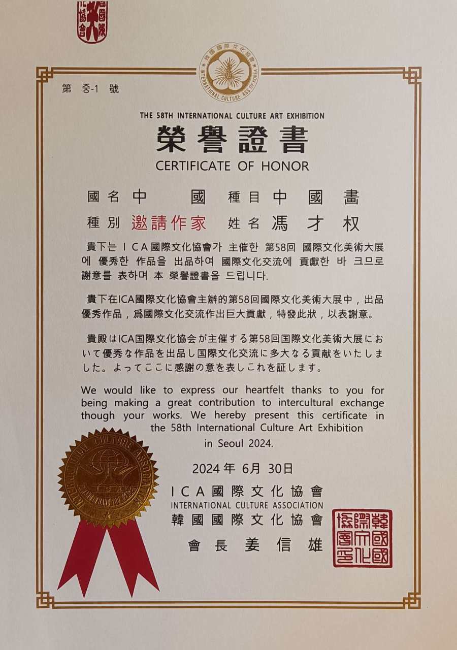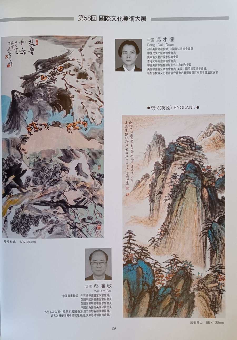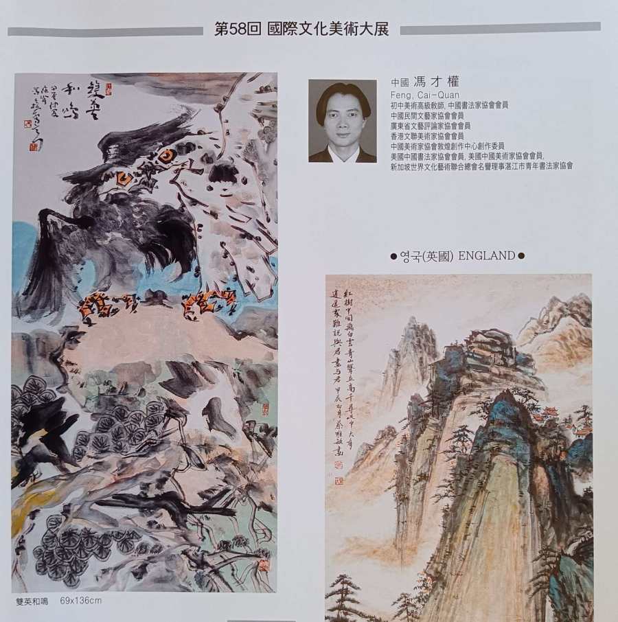 日前,由ICA国际文化协会主办,亚细亚文化协会、韩国文化艺术研究会后援,国际文化展执行委员会主管的“第58回国际文化美术大展”,在韩国美术馆开幕,徐闻籍美术工作者冯才权的4尺写意鹰画中堂《双英和鸣》受邀参展,并入编同名作品集第29页,受到各国观众的好评。