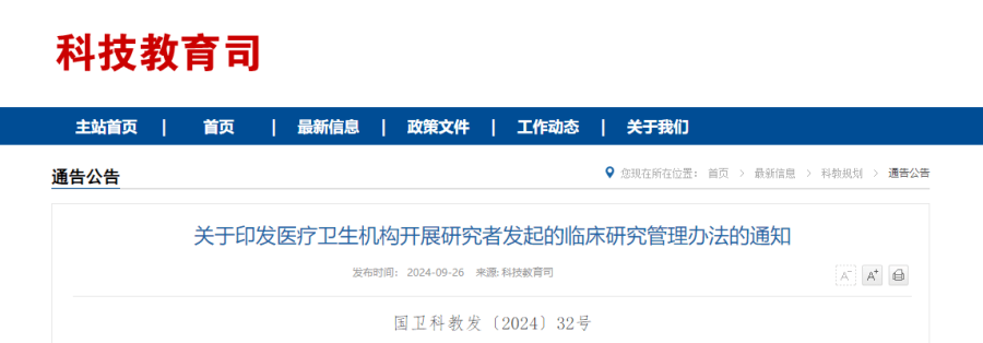 近日,国家卫生健康委员会、国家中医药管理局和国家疾病预防控制局联合印发了《医疗卫生机构开展研究者发起的临床研究管理办法》,2024年10月1日起施行。