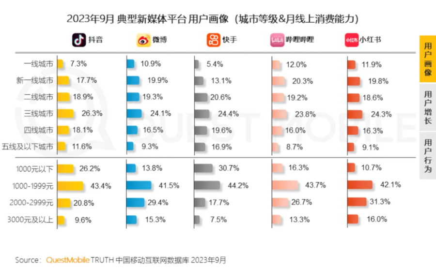 从整体用户数据上看,快手偏向下沉市场。Questmobile数据显示,2023年9月,快手的男用户群体是top5短视频平台中最高的;而且,快手在高线城市的用户比例也是5大平台中最低的,低线城市用户占比则从四线城市开始陡然升高。